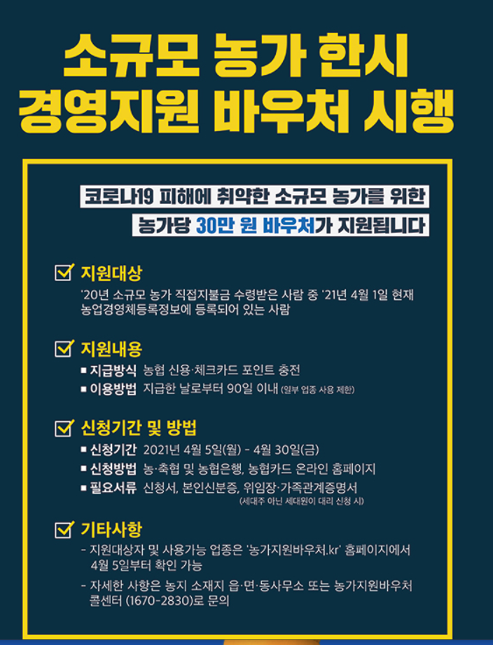 소농 바우처를 받은 농가는 고용노동부의 '긴급고용안전지원금', 중소벤쳐기업부의 '소상공인 버팀목자금 플러스' 등을 동시에 받을 수 없다.