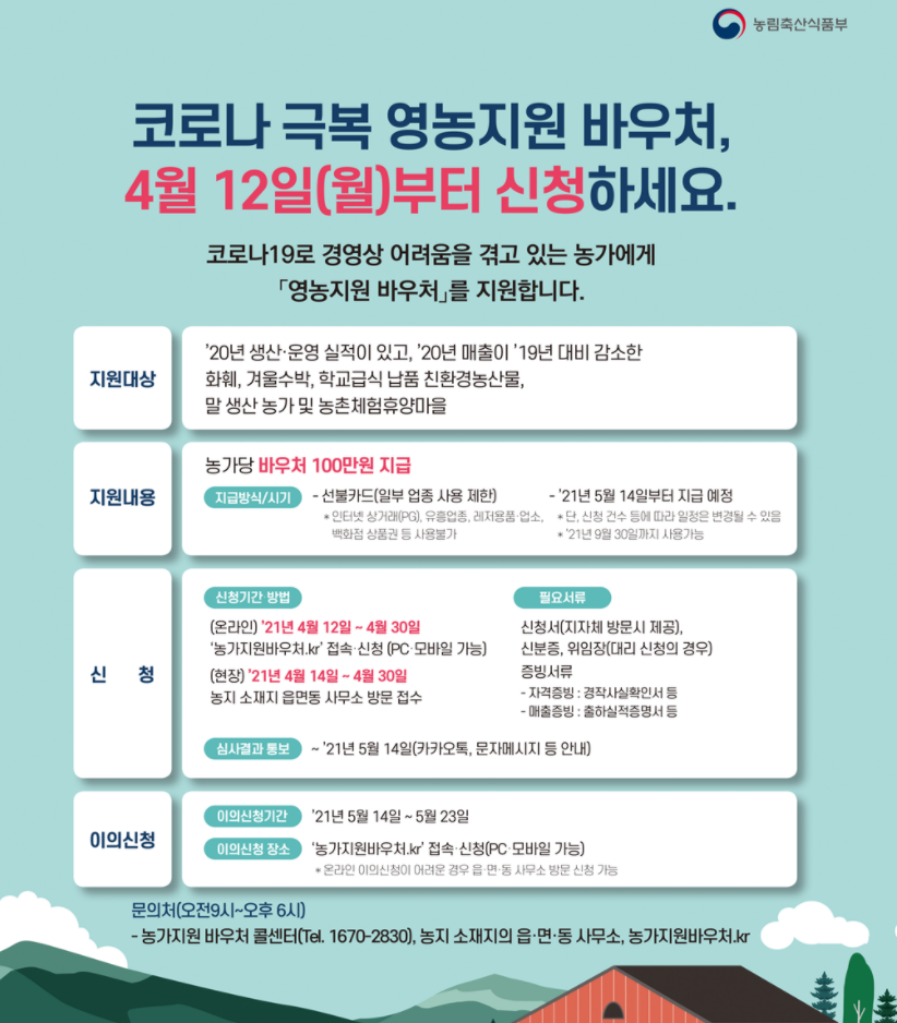 농민에게 지급되는 4차 재난지원금은 소농에 30만원씩 지급하는 '한시경영지원 바우처'와 코로나19 피해집중 5대 분야에 1농가당 100만원씩 지급하는 '코로나 극복 영농지원 바우처'등 2가로 나뉜다.